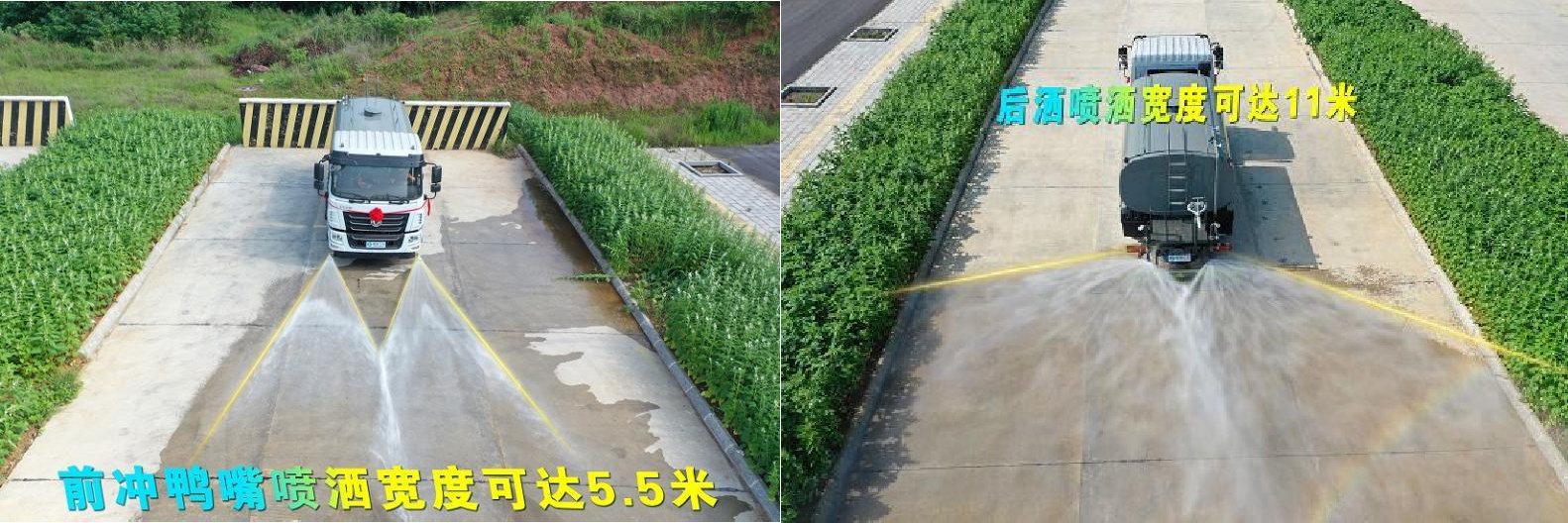 我公司產(chǎn)品標(biāo)配前噴(鴨嘴)、后沖、后灑、側(cè)噴、后置式工作平臺(tái),平臺(tái)上配置綠化水炮(可 360°旋轉(zhuǎn),既可以調(diào)成柱狀,也可以調(diào)成霧狀,更可以調(diào)成直沖狀、大雨、中雨、小雨、毛毛雨),配備優(yōu)質(zhì)大功率專用灑水泵(可自吸自排,可從河里或池塘抽水到罐體),取力器,雜物過濾網(wǎng),消防接口,自流球閥系統(tǒng)、取力器、球閥、濾網(wǎng)均為國家標(biāo)準(zhǔn)產(chǎn)品,主管道加粗,法蘭墊、法蘭盤加厚,大通徑球閥。整體具備性能優(yōu)良安全可靠、效率高、流量大、維修方便等特點(diǎn)。