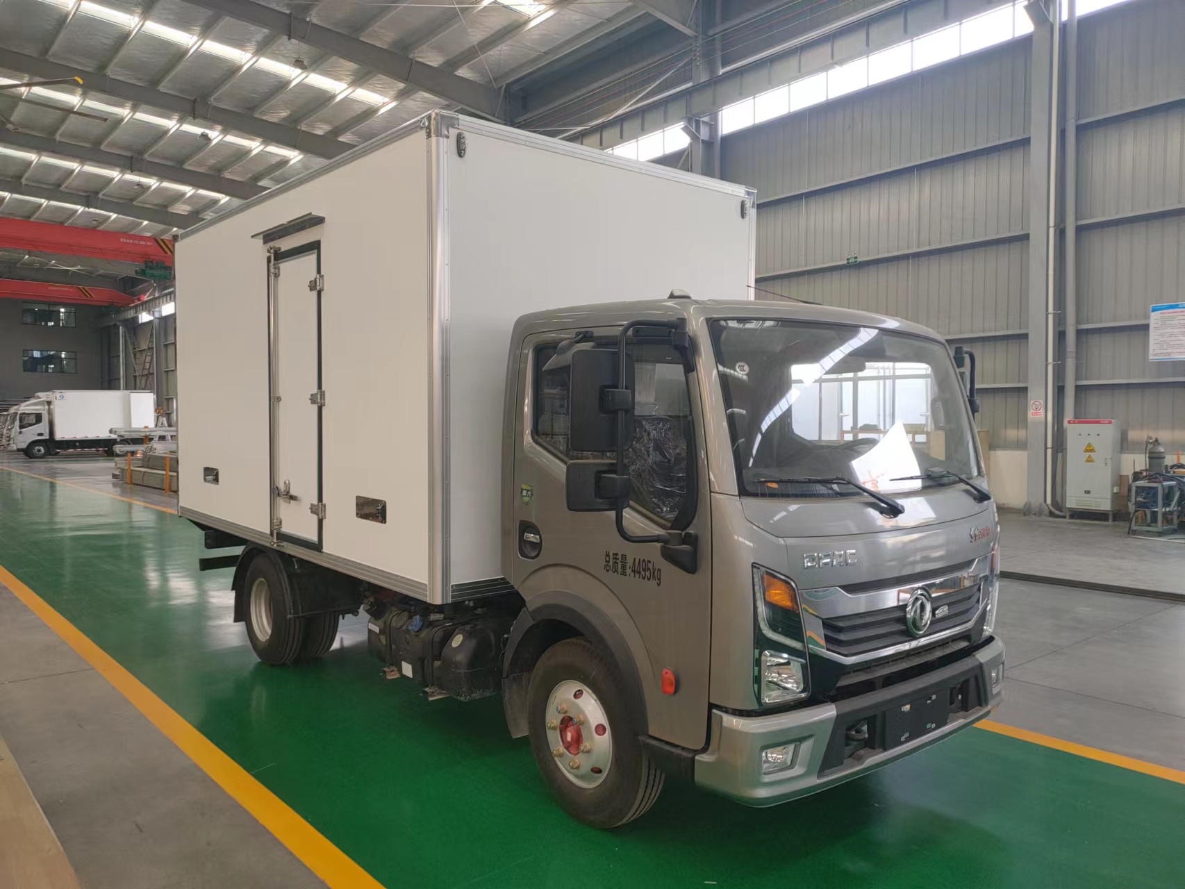 東風凱普特星云4.2米冷藏車采用東風輕型發動機或玉柴發動機,采埃付5擋變速箱,NPR沖壓后橋(帶制動襯片磨損報警),7.00R16輪胎,斷氣剎、單排翻轉、車載無線服務控制器(T-BOX)、ABS、離合助力、動轉,