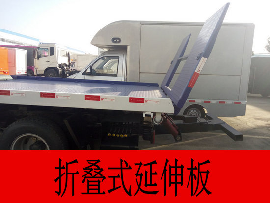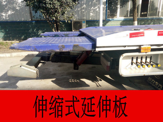 1.平板長度為:4.2米加上0.9米折疊板,寬均為2.35米,3P2A碳鋼板沖壓瓦楞型防滑板,平板帶有鎖止機構,平板及后拖臂均為雙側聯動操作;