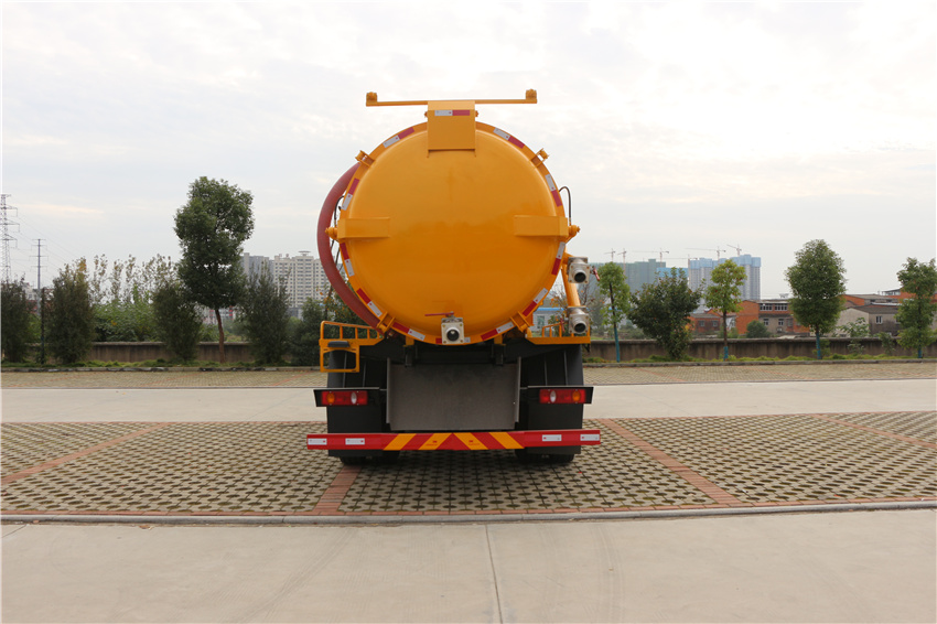 隨底盤選裝駕駛室,選裝側面及后部樣式;罐體總容量:11.03立方米,罐體有效容積:10.5立方米,罐體外形尺寸(直段長×直徑)(mm)4700×1850;整車長度/前懸/軸距/后懸對應關系(mm):8150/1430(1400)/4700/2020(2050),8150/1430(1400)/4500/2220(2250);/后防護材料均為:Q235碳鋼,連接方式均為:螺栓連接,后部防護截面尺寸(mm):120×50,后部防護離地高度(mm):450;ABS型號/生產廠家:3631010-C2000/東科克諾爾商用車制動系統(十堰)有限公司,ABS 8/東科克諾爾商用車制動系統(十堰)有限公司, 4460046450/威伯科汽車控制系統(中國)有限公司,J ABS/焦作博瑞克控制技術有限公司;該車主要用于吸除水溝、下水道污濁物;主要裝置為貯污罐及吸污裝置。卸料方式:舉升后卸。