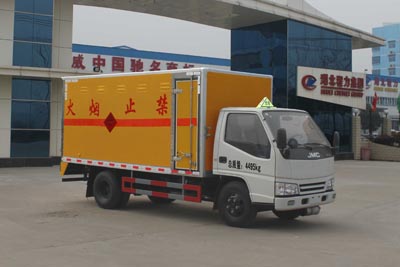 廂體頂部封閉,不可開啟。隨底盤選裝駕駛室。 并選裝側開門。側/后防護裝置材料材質為Q235A碳鋼,側防護與副梁,后防護裝置與車架均采用焊接連接,后防護斷面尺寸(寬贅?50?00(mm),離地高度為440mm.運輸品名:炸藥,雷管,煙花爆竹等,類項號:1.1B,1.1D,1.1G,1.2G,1.3G,1.4G等;安裝帶衛星定位功能的行駛記錄儀;配裝限速裝置,最高時速80km/h。僅采用有前盤制動器和安裝ABS的底盤。僅采用子午線輪胎。僅采用排氣管前置的底盤。該車裝有ABS;ABS型號:355080020,生產廠家:浙江亞太機電股份有限公司。僅采用JX493ZLQ4發動機,油耗值為12.6。